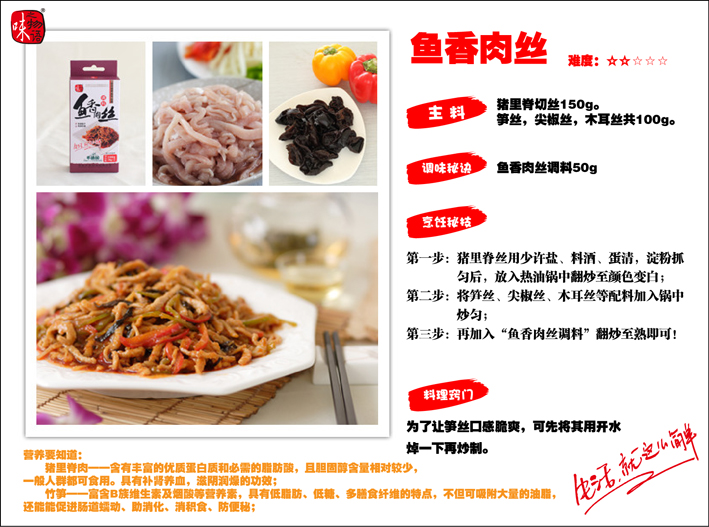 主料:豬里脊切絲150g。配料:筍絲,尖椒絲,木耳絲共100g。
